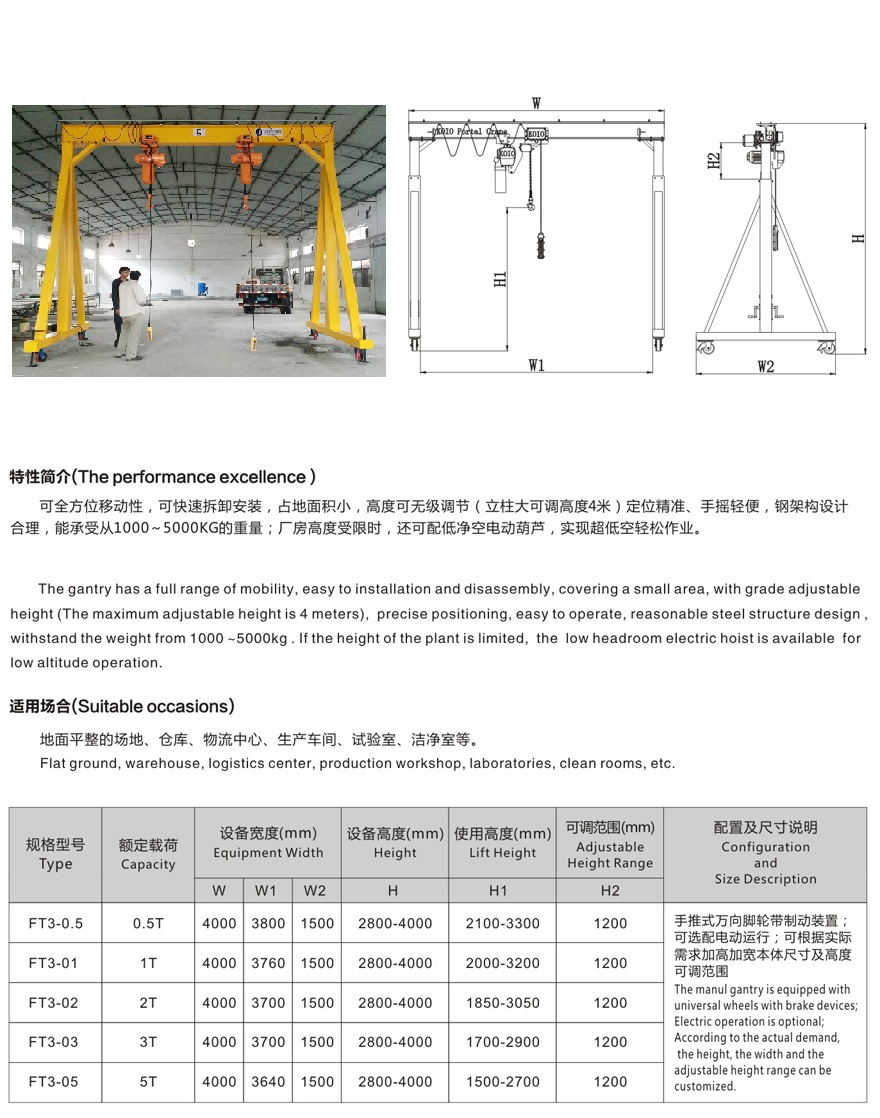 性能優(yōu)點:該款產(chǎn)品具有結(jié)構(gòu)簡單、可靈活組裝和轉(zhuǎn)運、可移動性強(qiáng)、經(jīng)濟(jì)實惠及安全性能高等優(yōu)點,能承受從1000~5000KG的重量;廠房高度受限時,可配低凈空電動葫蘆,實現(xiàn)超低空輕松作業(yè)。