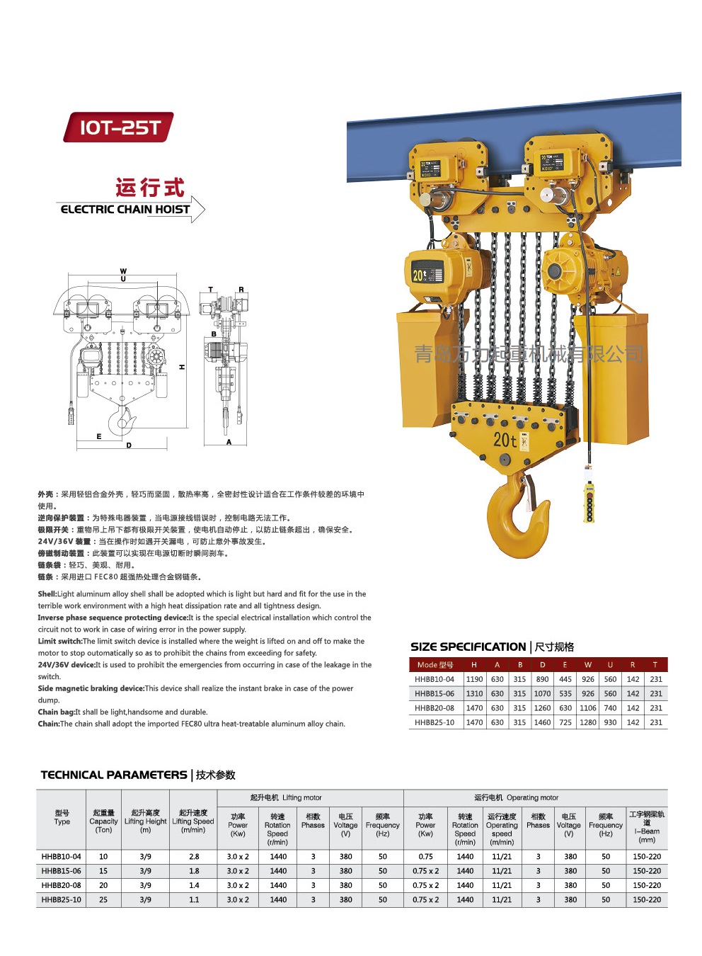 極限開關:吊上吊下都有開關裝置,使自動停止,防止鏈條超出,確保安全。