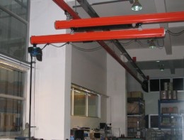 KBK單梁懸掛起重機,是利用標準直線段軌道和其他輔助標準部件組合而成。主梁兩端的小車行走部分,可在與主梁方向垂直的兩條平行吊掛KBK軌道中運行。單梁與PK型環鏈電動葫蘆配套使用,環鏈葫蘆運行小車沿著主梁方向運行。KBK單梁懸掛起重機很大跨度8m ,很大起重量至--1000kg 。起重機梁和行走機構之間的連接采用萬向球接頭,這樣起重機不會出現夾緊現象,并能毫無阻礙地通過軌道的楔形地段和突出部分。