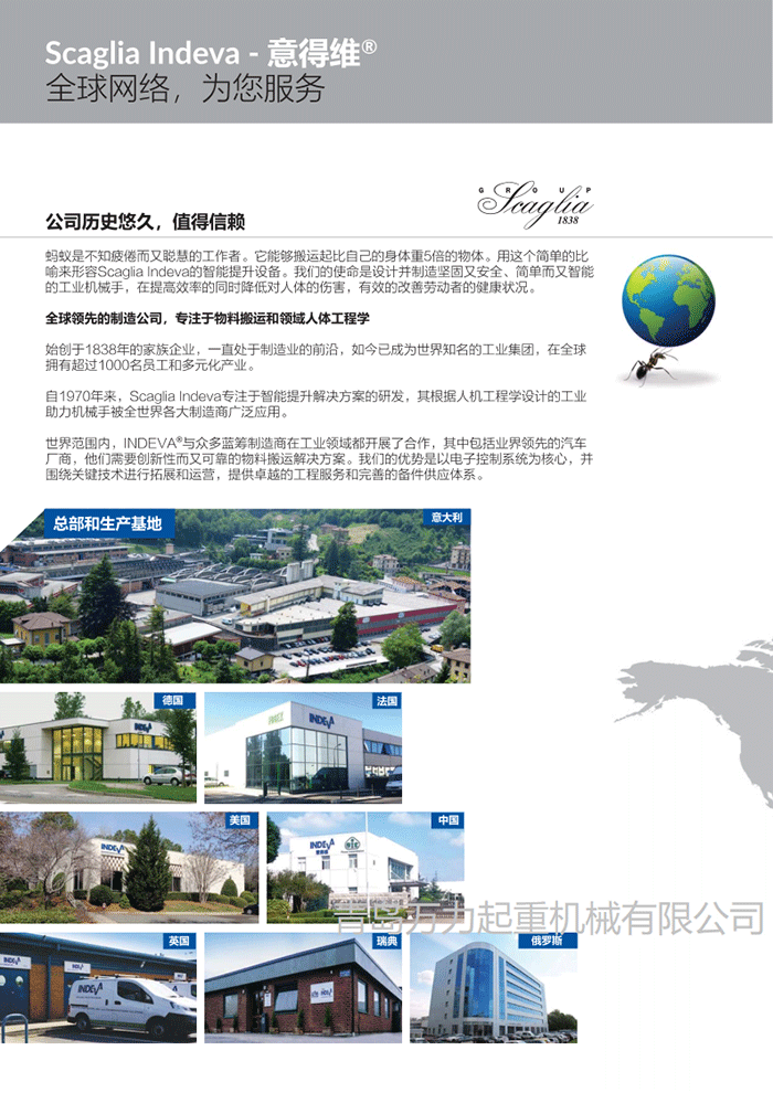 1、Scaglia集團(tuán)成立于1838年,專(zhuān)注于物料搬運(yùn)及工業(yè)操縱器,INDEVA自1975年開(kāi)始開(kāi)發(fā)和生產(chǎn)了世界上第一臺(tái)電子智能助力機(jī)械手。